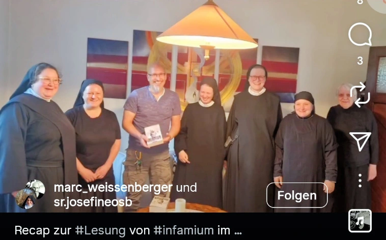 Als Benediktinerinnen war es für uns eine besondere Freude, dass ausgerechnet ein Roman über Benediktiner unser Herz so ergriffen hat. Marc freute sich über diese Rückmeldung von uns umso mehr – und bot spontan an, uns zu besuchen und eine Autorenlesung zu halten. Dieses Erlebnis war für alle eindrücklich, und auch die Schwestern, die sein Buch bisher nicht kannten, bekamen große Lust, es zu lesen.