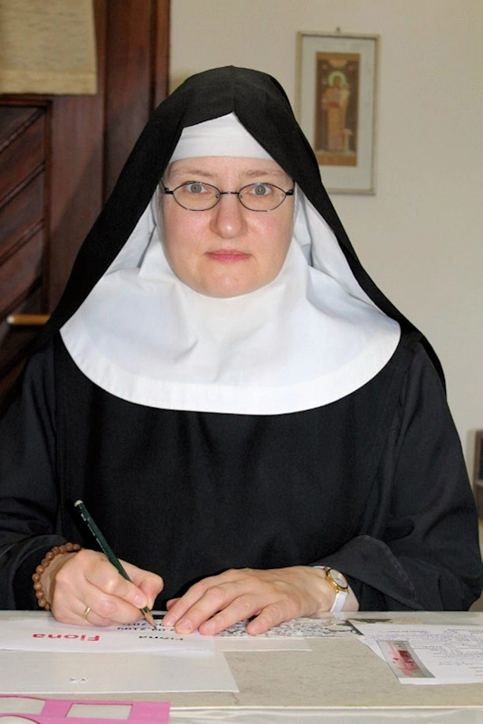 Ich wurde 1965 in Bremen geboren und bin dort aufgewachsen. Ich wurde evangelisch getauft und konfirmiert. Nach der Grundschule besuchte ich die Realschule und danach die zweijährige Höhere Handelsschule. Dann absolvierte ich eine 2 ½-jährige Ausbildung als Bankkauffrau, wurde anschließend ins Angestelltenverhältnis übernommen und arbeitete ca. noch für 2 ½ Jahre dort. Dann trat ich hier ins Kloster ein. Das war 1990 als ich 24 Jahre alt war. Heute bin ich 57 und in der Hauptaufgabe Kantorin, das heißt, ich bin für den Gesang zuständig, außerdem verziere ich Kerzen, erfülle ein paar Aufgaben im Haushalt, kümmere mich um die Bibliothek, bin Ordensdatenschutzbeauftragte, Präventionsbeauftragte unserer Gemeinschaft, habe noch andere kleine Aufgaben bei uns im Kloster. 2015 schloss ich den Grundkurs des Würzburger Theologischen Fernkurses ab, weil ich mich sehr für Theologie und Spiritualität interessiere. Im Juli 2022 wurde ich zur Subpriorin (Stellvertreterin der Priorin) ernannt. Vom Herbst 2022 bis April 2024 absolvierte ich eine Ausbildung in geistlicher Begleitung, die mich persönlich und spirituell sehr gefördert hat. Ich darf sagen, dass ich ein wirklich erfülltes Leben führe, mit dem ich sehr zufrieden bin.